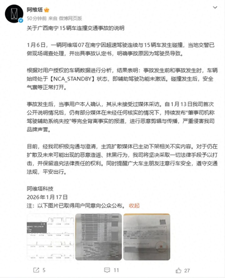 1月6日,一辆阿维塔07在南宁因超速驾驶连续与15辆车发生碰撞,当地交警已做现场调查处理,并出具事故认定书,明确事故原因为驾驶员导致。